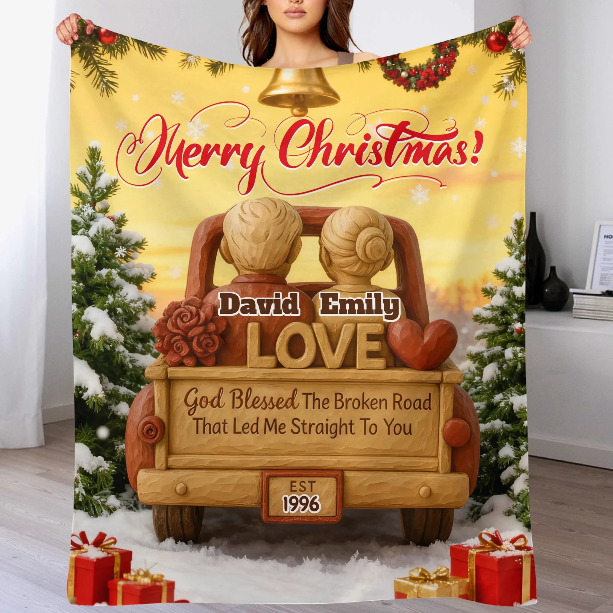 Available Product: God Blessed The Broken Road, Car And Hearts Customized Flannel Blanket - Personalized Names and Year - Christmas Gift For Couples