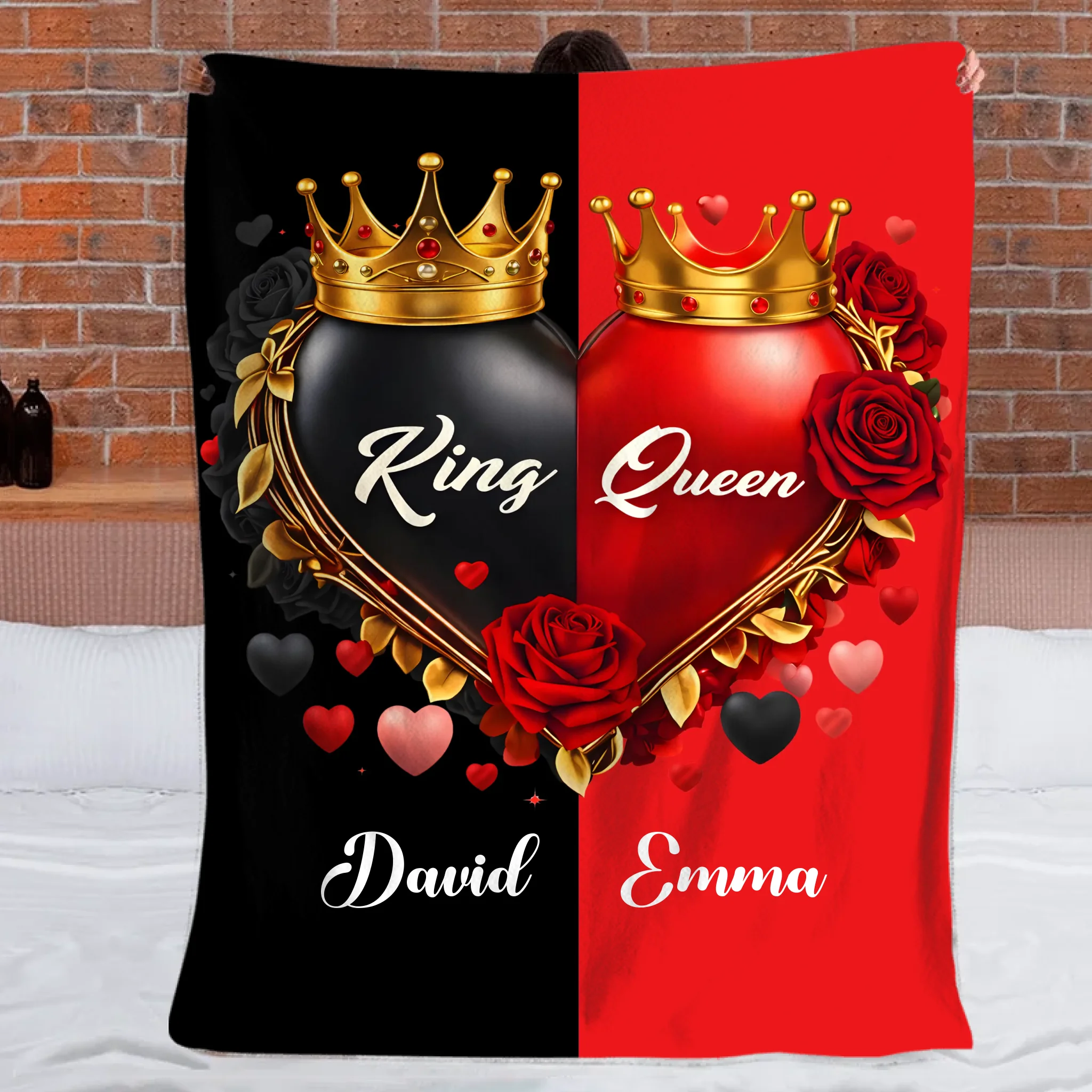 King & Queen Heart-Shaped Customized Blanket - Personalized Name - Gift For Him/Her, Couples